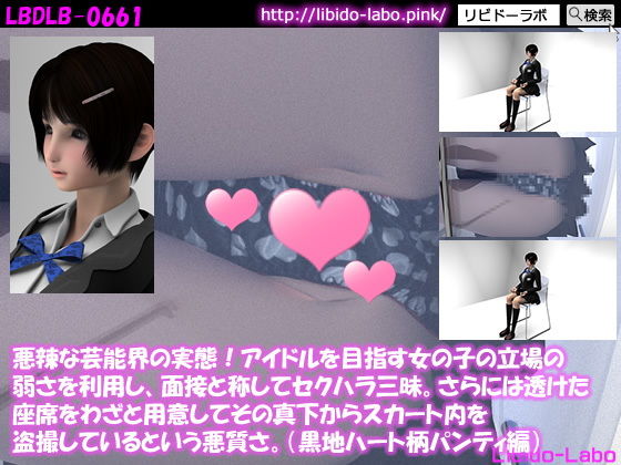 悪辣な芸能界の実態!アイドルを目指す女の子の立場の弱さを利用し、面接と称してセクハラ三昧。さらには透けた座席をわざと用意してその真下からスカート内を盗撮しているという悪質さ。(黒地ハート柄パンティ編)の作品詳細