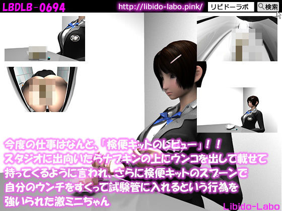 今度の仕事はなんと、「検便キットのレビュー」!!スタジオに出向いたらナプキンの上にウンコを出して載せて持ってくるように言われ、さらに検便キットのスプーンで自分のウンチをすくって試験管に入れるという行為を強いられた激ミニちゃんの作品詳細