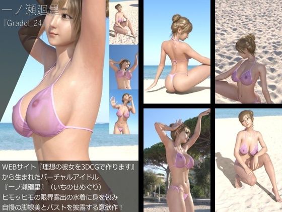 WEBサイト『理想の彼女を3DCGで作ります』から生まれた写実的ヴァーチャルアイドル女優「一ノ瀬廻里(いちのせめぐり)」の写真集です。表紙を含めて全62ページです。ナマ脚に自信があるという彼女。ヒモヒモの限界露出水着で彼女の肢体を存分に堪能できます。担当大元の画像が横1820×縦2570ピクセルのため、作品本体はPDFですがかなりの拡大に耐えます。 …